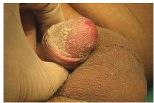 網友:不知道為什么,這段時間,不知道是因為夏天的原因還是怎么了,總感覺下面不舒服,并且我的龜頭上有白色污垢這是怎么回事?昭通昆大醫院男科專家介紹說,根據患者所說的情況應該是因為包皮過長造成的龜頭炎癥狀表現。如圖可見:
